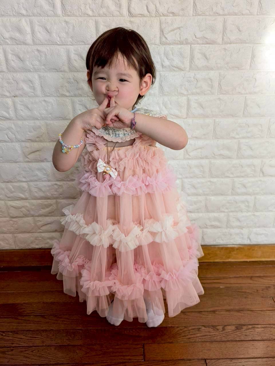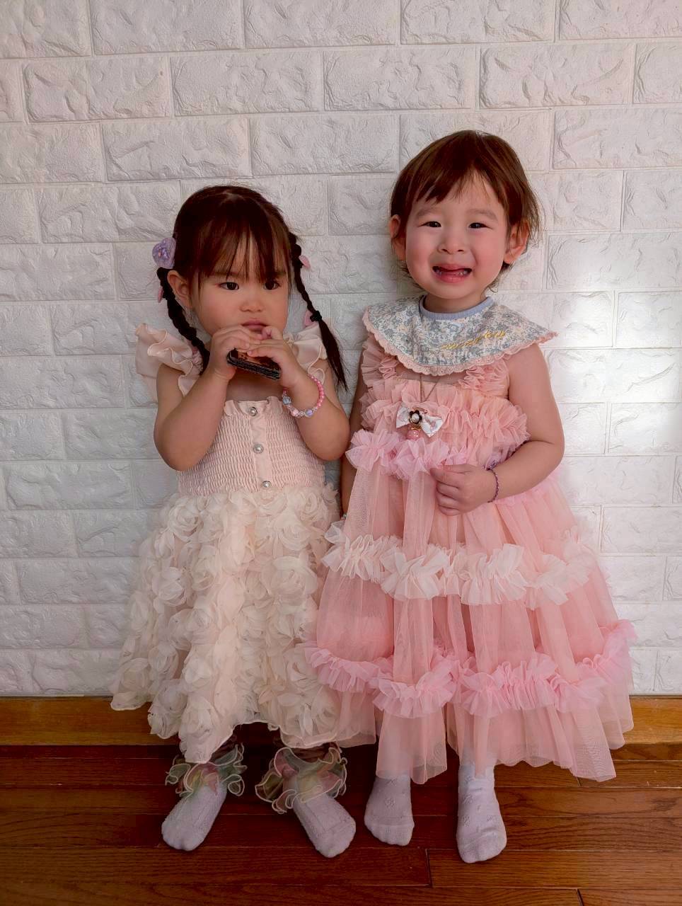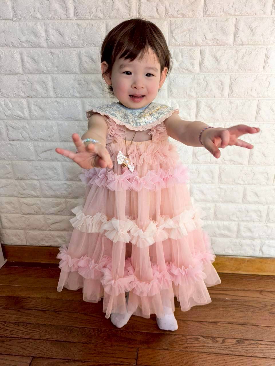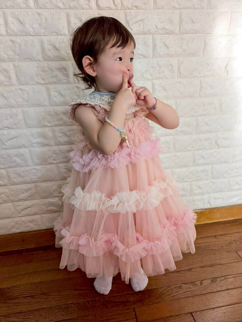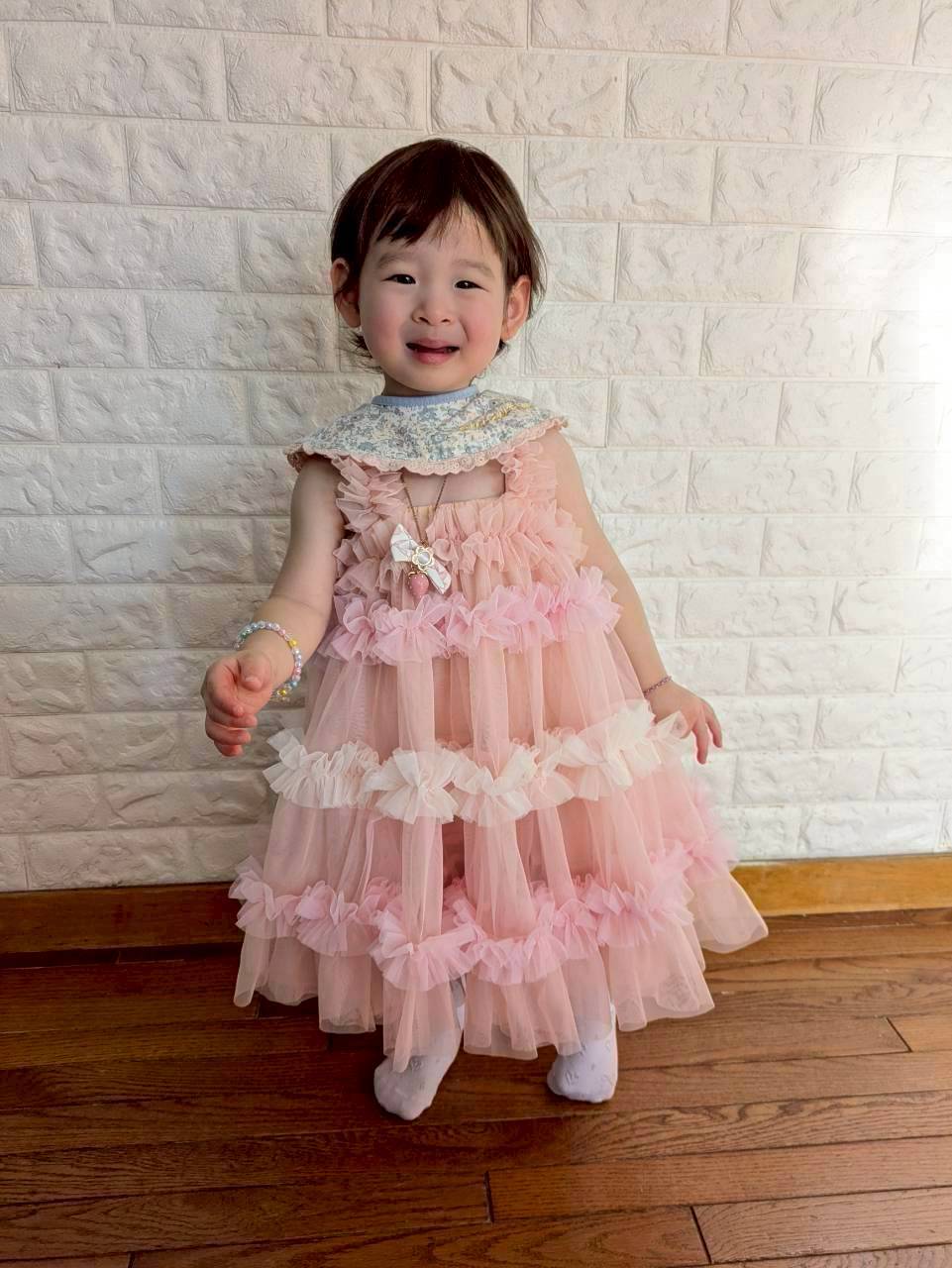 胸元から裾までたっぷりあしらわれたチュールフリルが動くたびにふわっと揺れ、写真映えも抜群。