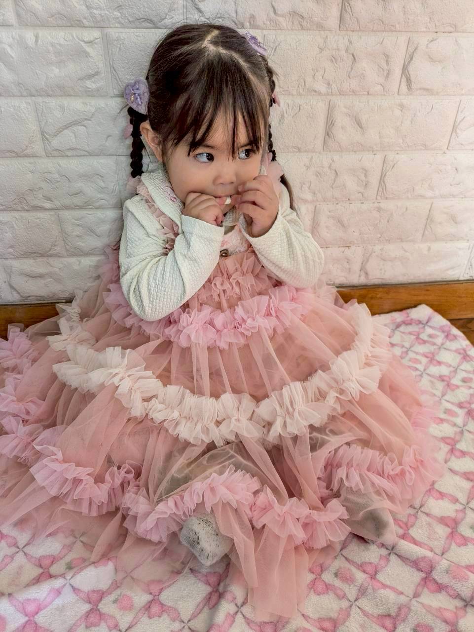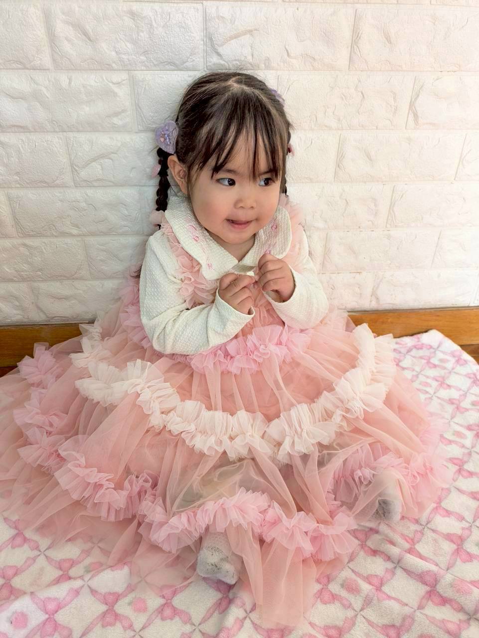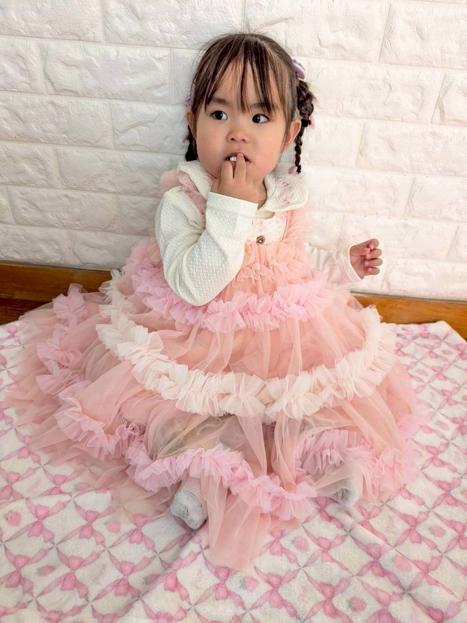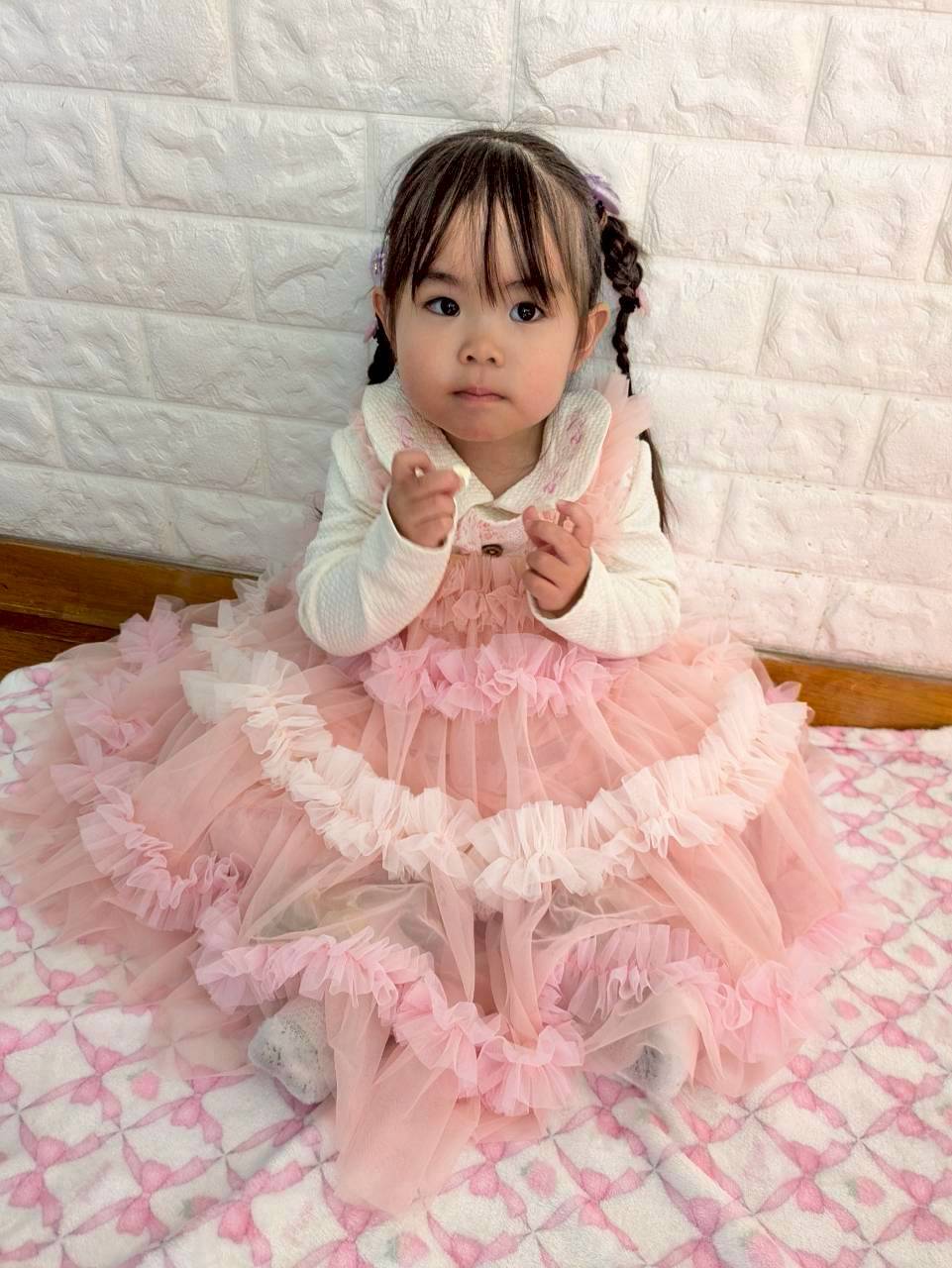 やさしいピンクカラーと立体感のあるフリルデザインが、特別感たっぷりの一着です。