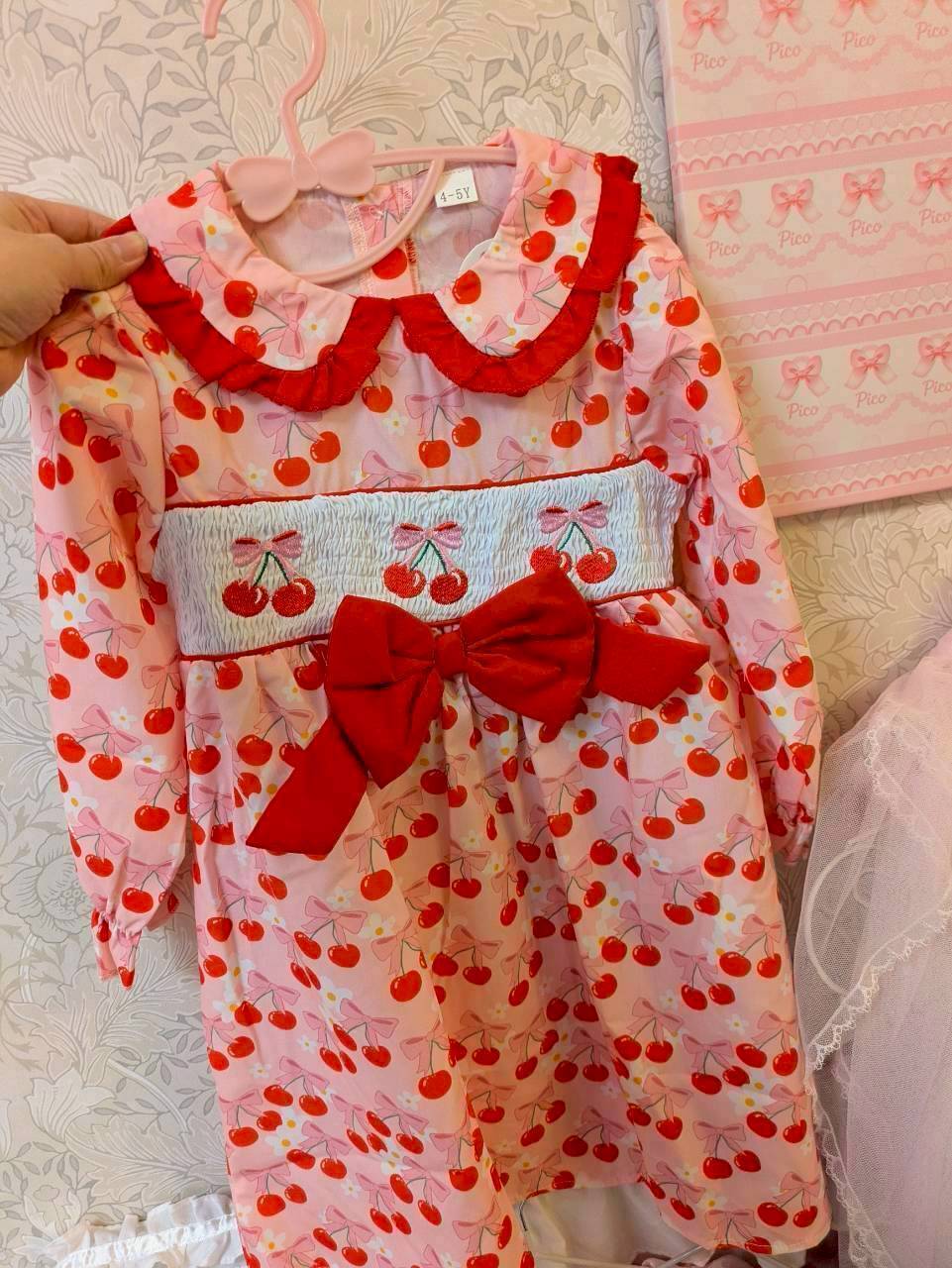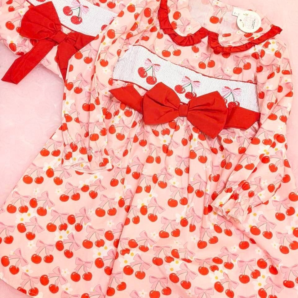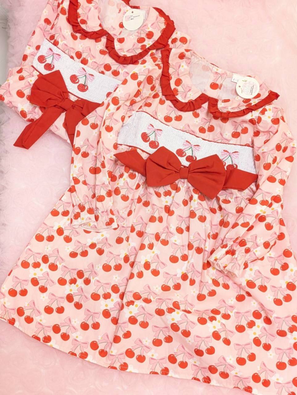 胸元にはチェリー刺繍入りのシャーリングデザインを施し、立体感のある大きな赤リボンがアクセントに。